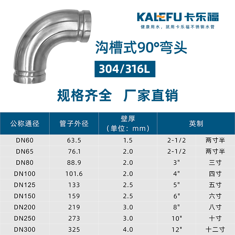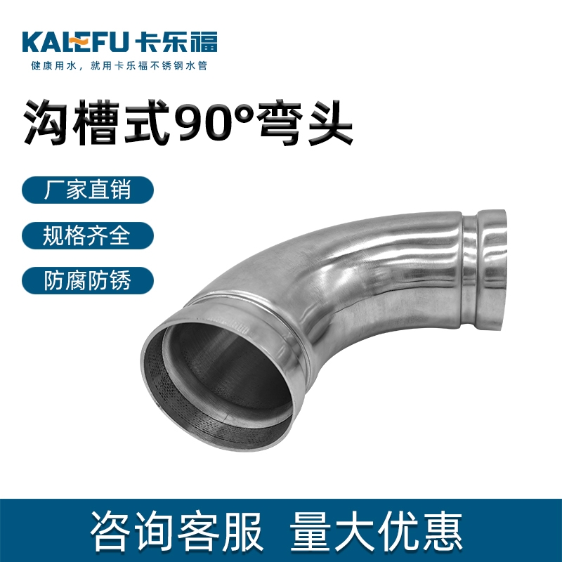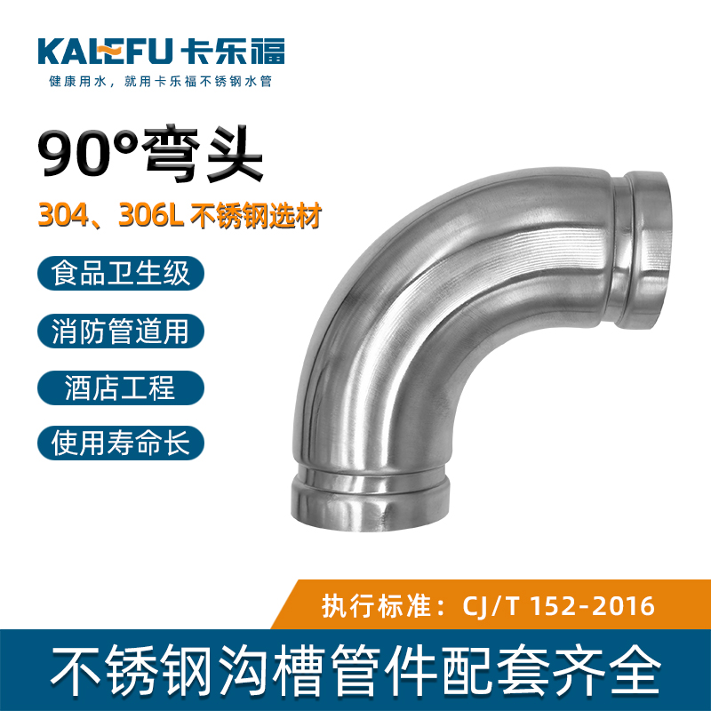 不銹鋼水管溝槽管件,溝槽式90°彎頭,90度彎頭,采用304 316L食品級不銹鋼材質,DN60-DN300通徑。本不銹鋼水管溝槽管件,溝槽式90°彎頭執行標準CJ/T 152-2016.