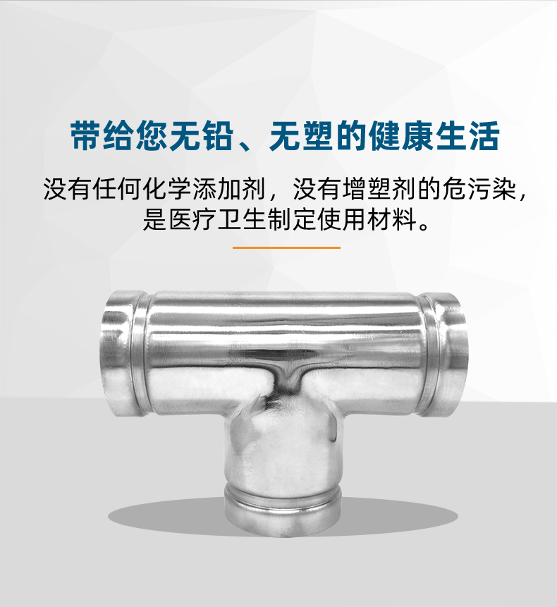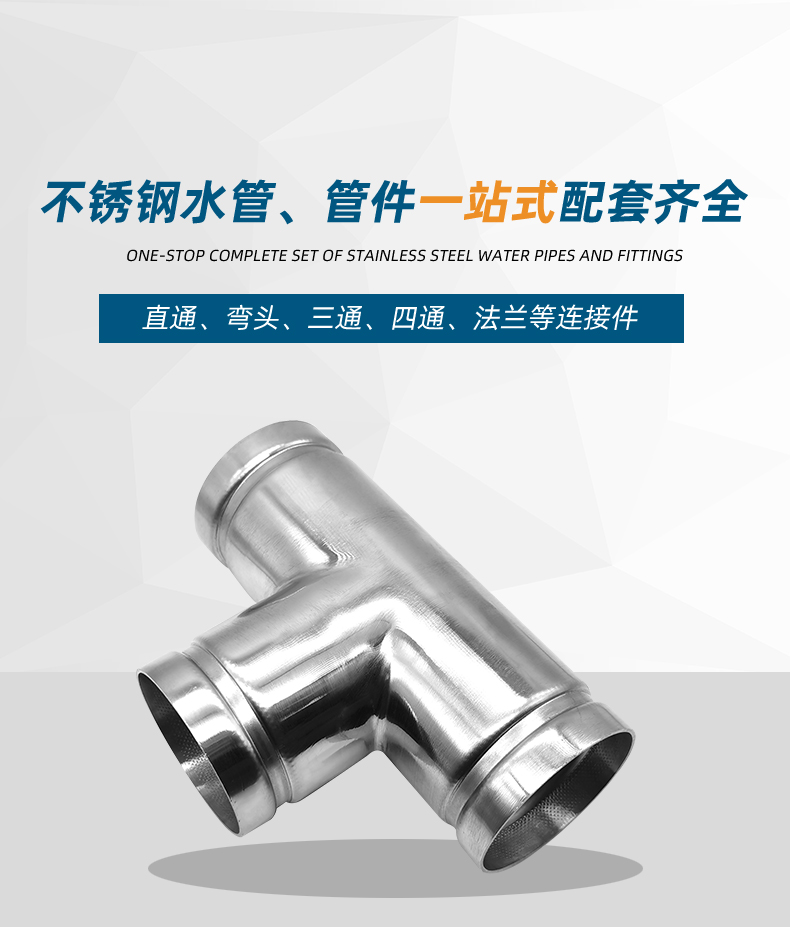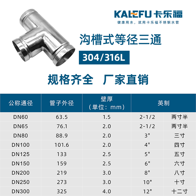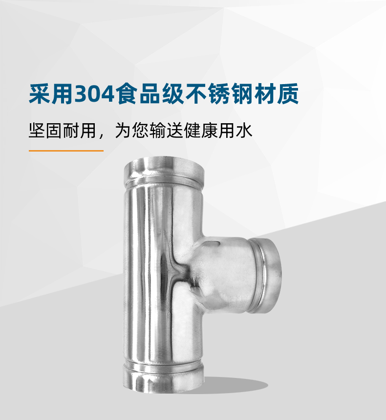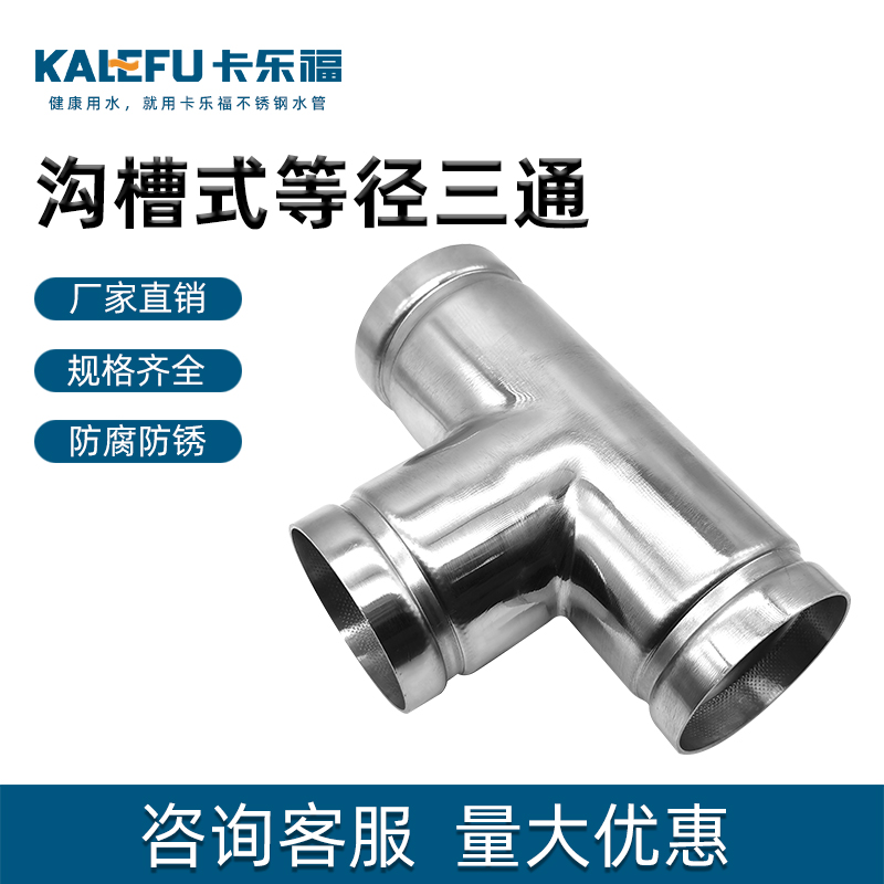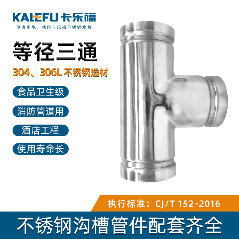不銹鋼水管溝槽管件,溝槽式等徑三通采用304 316L食品級不銹鋼材質,DN60-DN300通徑。本不銹鋼水管溝槽管件,溝槽式等徑三通執行標準CJ/T 152-2016.