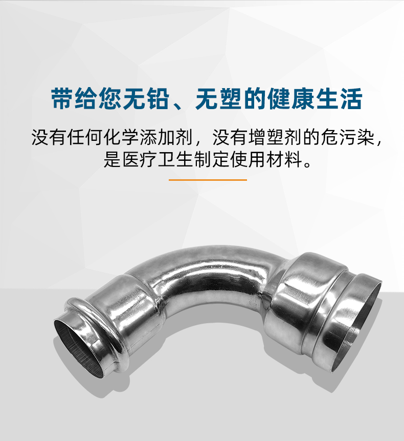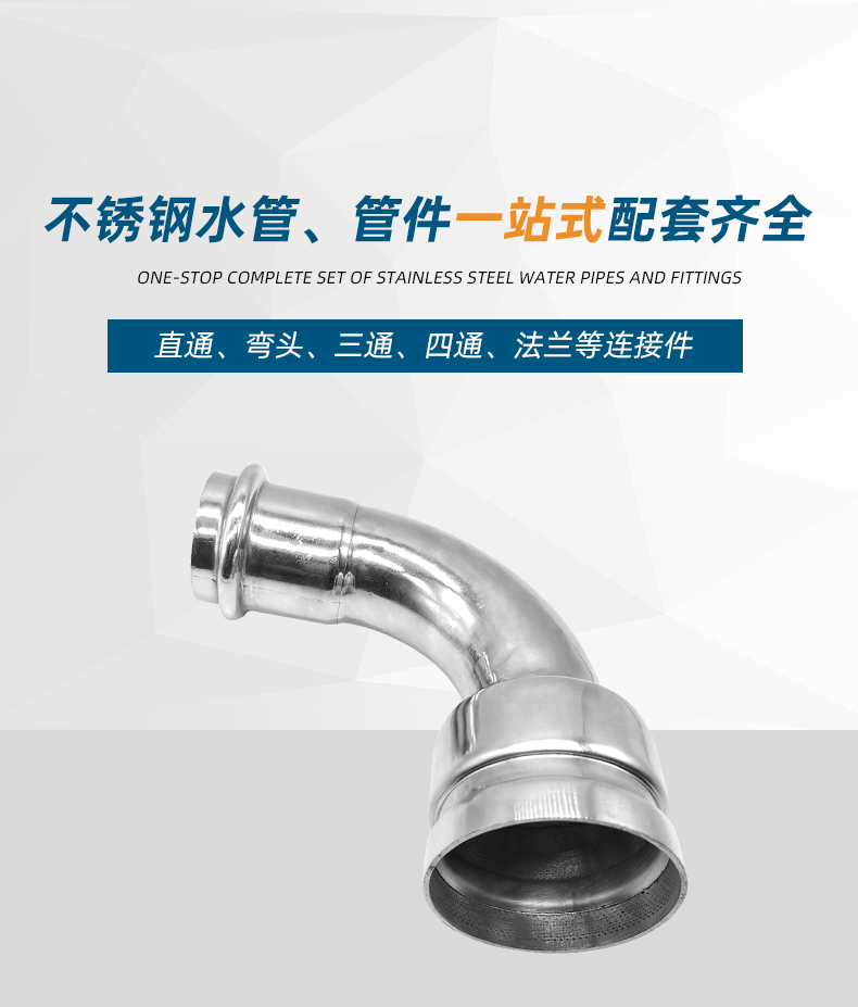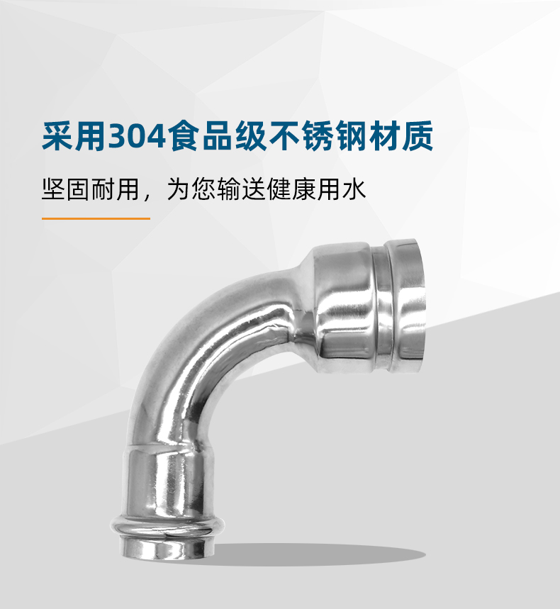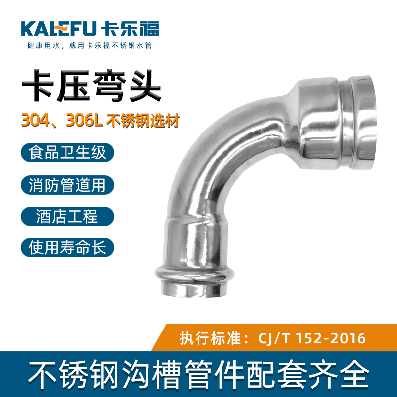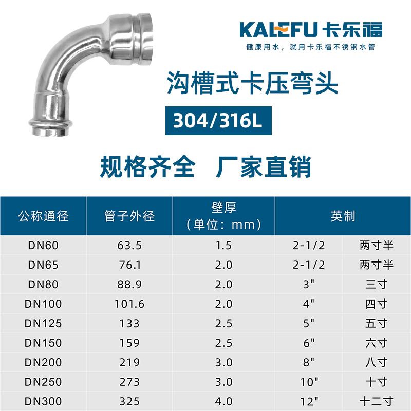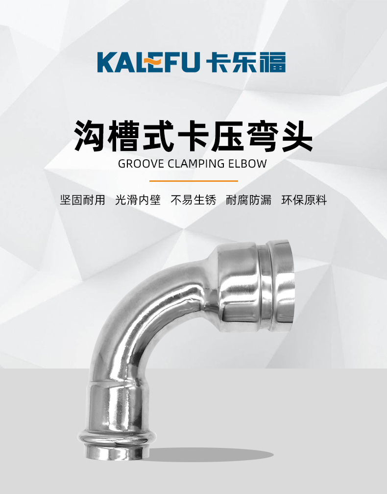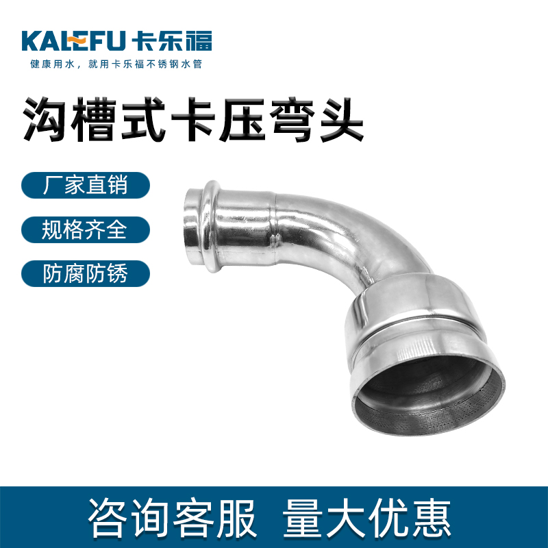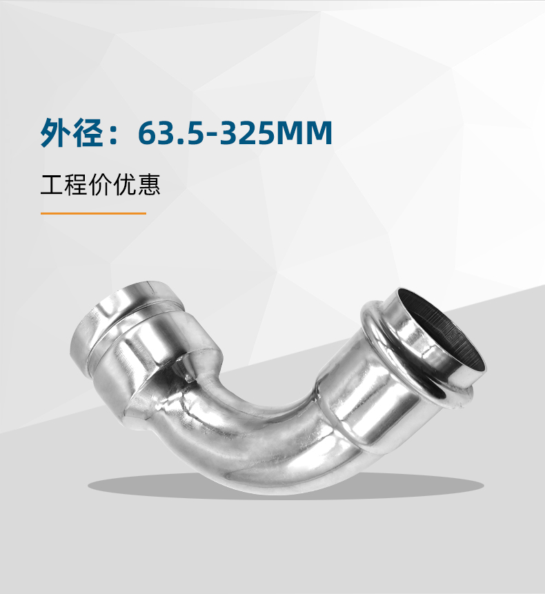 不銹鋼水管溝槽管件,溝槽卡壓異徑彎頭,采用304 316L食品級不銹鋼材質,DN60-DN300通徑。本不銹鋼水管溝槽管件,溝槽卡壓異徑彎頭執行標準CJ/T 152-2016.