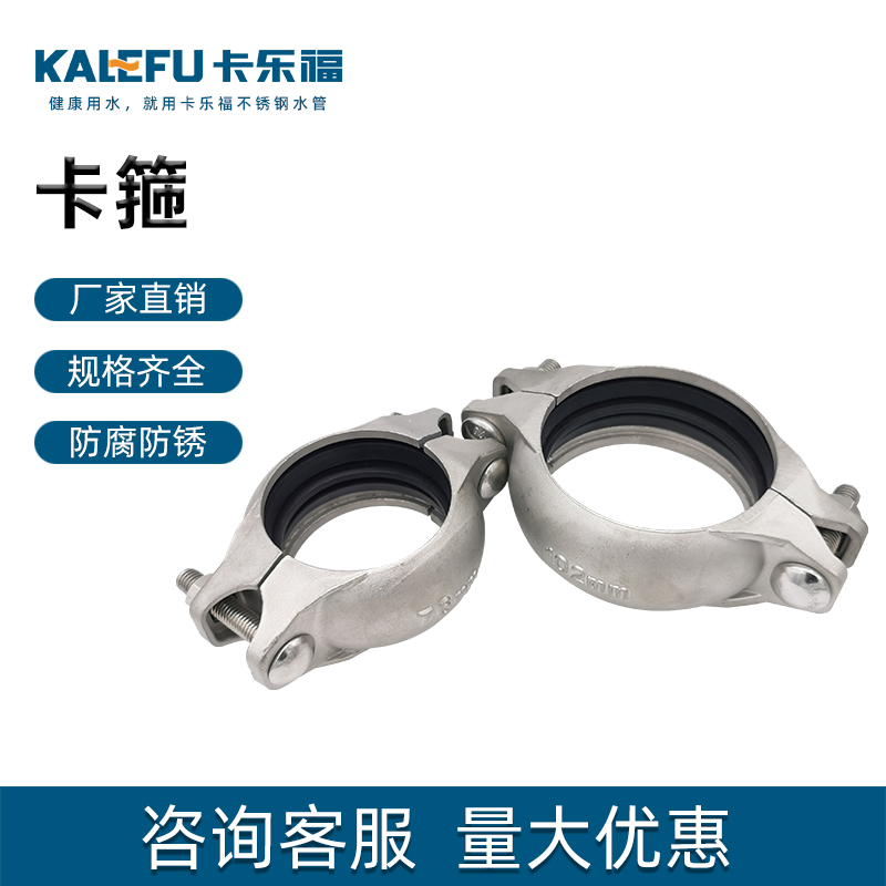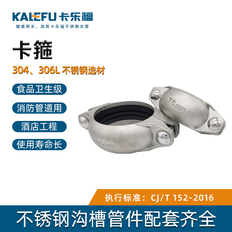 不銹鋼水管溝槽管件,溝槽式卡箍,采用304 316L食品級不銹鋼材質,DN60-DN300通徑。本不銹鋼水管溝槽管件,溝槽式卡箍執行標準CJ/T 152-2016.