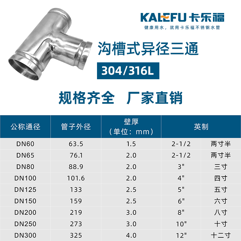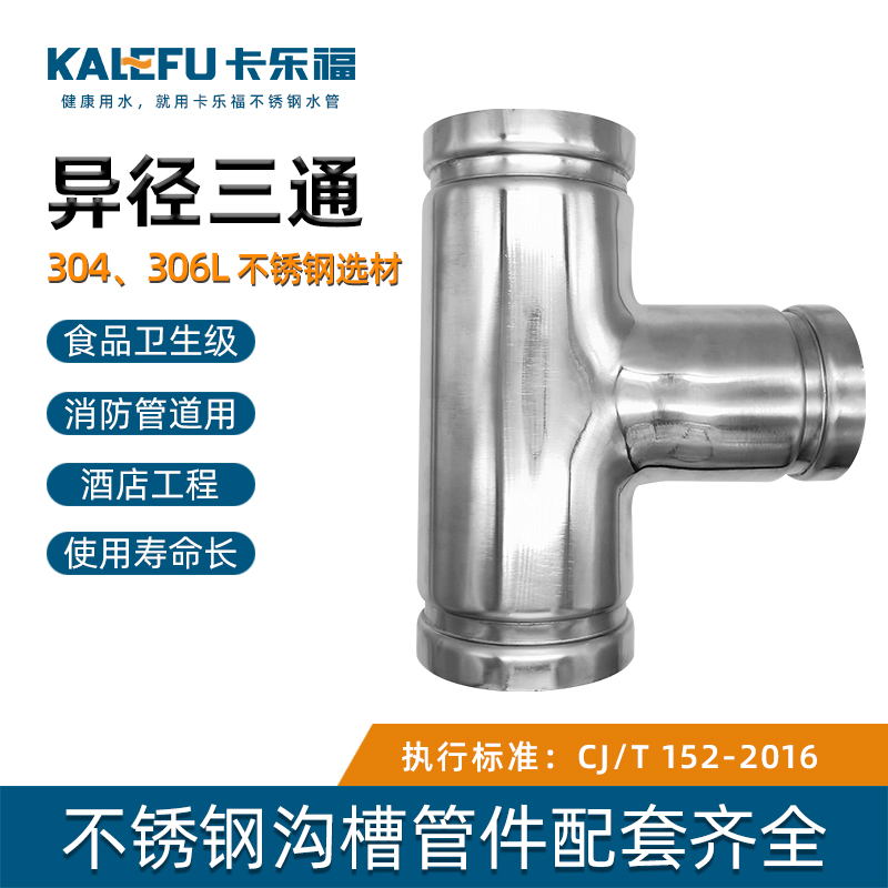 不銹鋼水管溝槽管件,溝槽式異徑三通,采用304 316L食品級不銹鋼材質,DN60-DN300通徑。本不銹鋼水管溝槽管件,溝槽式異徑三通執行標準CJ/T 152-2016.