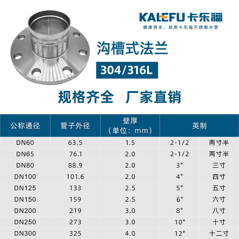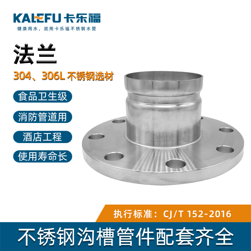 不銹鋼水管溝槽管件,溝槽式法蘭,304 316L食品級不銹鋼材質(zhì),DN60-DN300通徑。溝槽式法蘭本執(zhí)行標(biāo)準(zhǔn)CJ/T 152-2016.