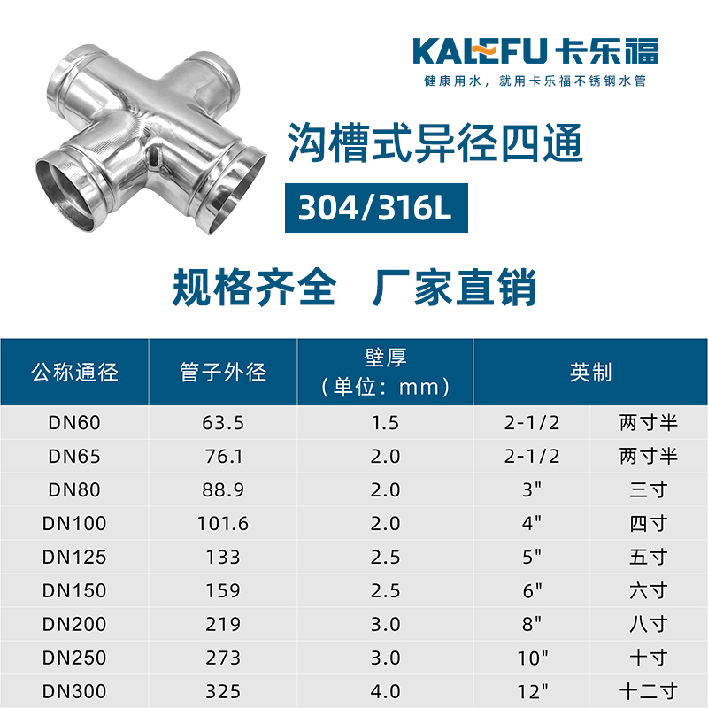 不銹鋼水管溝槽管件,溝槽式異徑四通,采用304 316L食品級不銹鋼,DIN60-DN300通徑。本溝槽式異徑四通執(zhí)行標(biāo)準(zhǔn)CJ/T 152-2016.