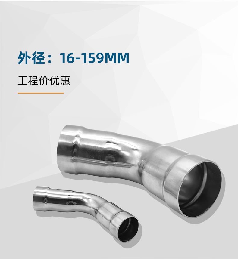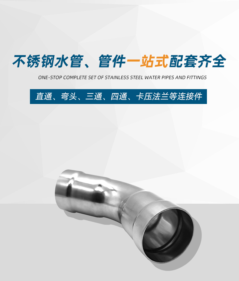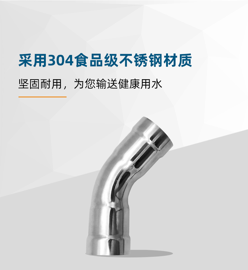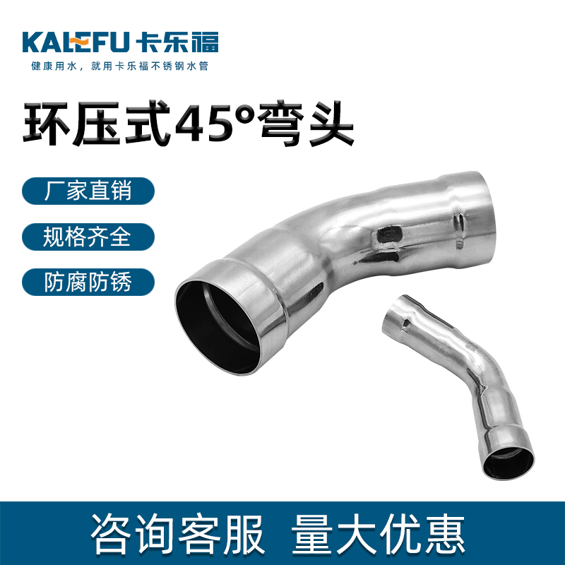 不銹鋼水管環壓式管件,環壓式45°彎頭,45度彎頭,采用304 316L食品級不銹鋼材質,DN615-DN150通徑。 本不銹鋼水管環壓式管件,環壓式45°彎頭,45度彎頭執行標準GB/T 33926-2017。