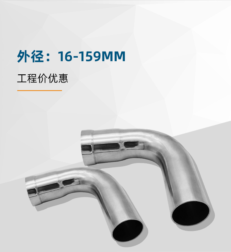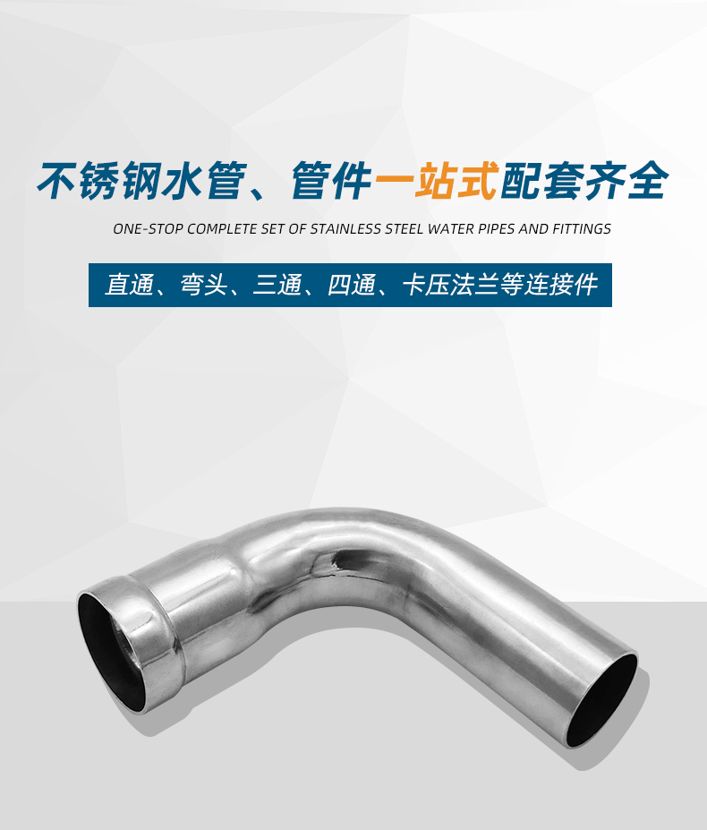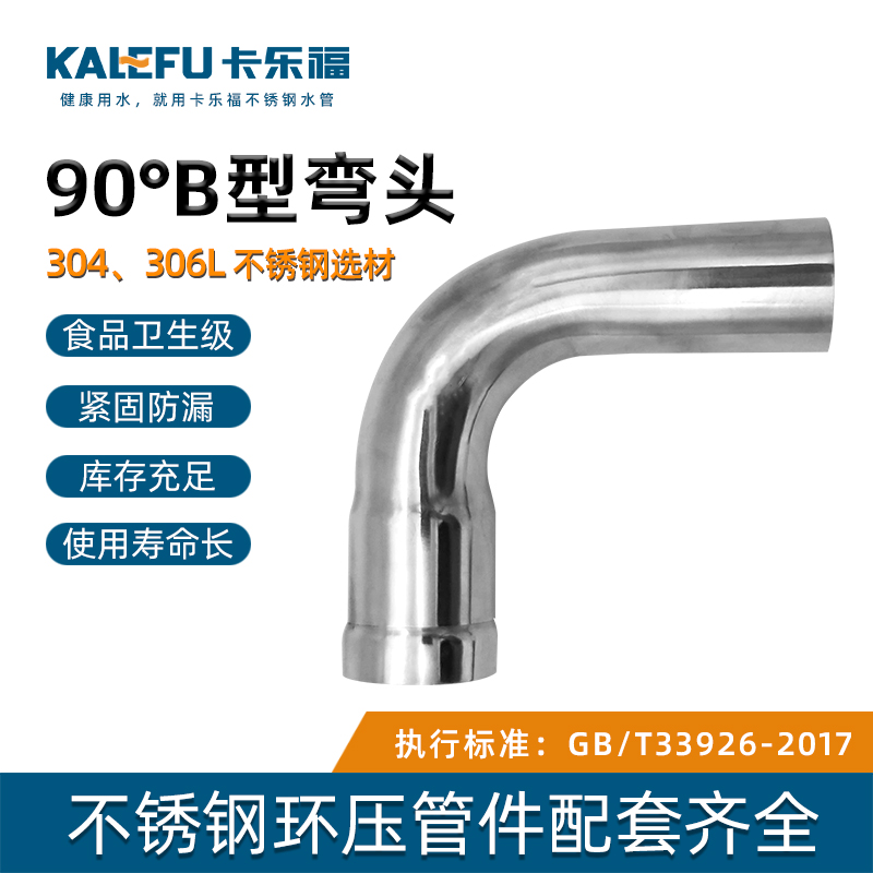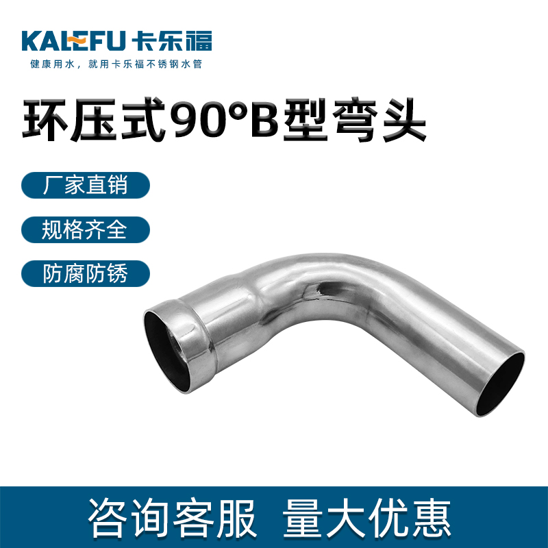 不銹鋼水管環壓式管件,環壓式90°B型彎頭,采用304 316L食品級不銹鋼材質,DN15-DN150通徑。不銹鋼水管環壓式管件,環壓式90°B型彎頭執行標準GB/T 33926-2017。