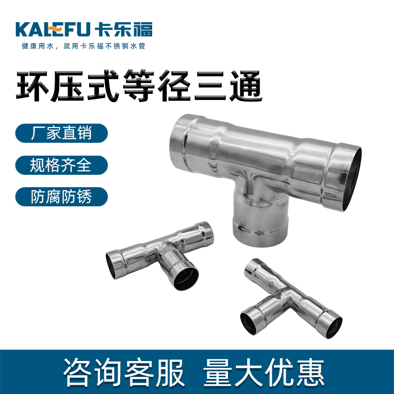 不銹鋼水管環(huán)壓式管件,環(huán)壓式等徑三通,采用304 316L食品級(jí)不銹鋼材質(zhì),DN15-DN150通徑。本不銹鋼水管環(huán)壓式管件,環(huán)壓式等徑三通執(zhí)行標(biāo)準(zhǔn)GB/T 33926-2017。