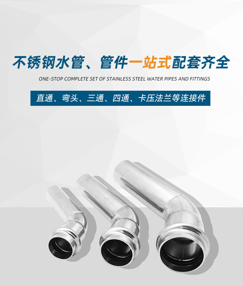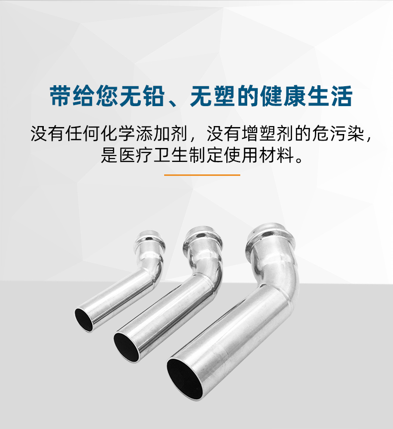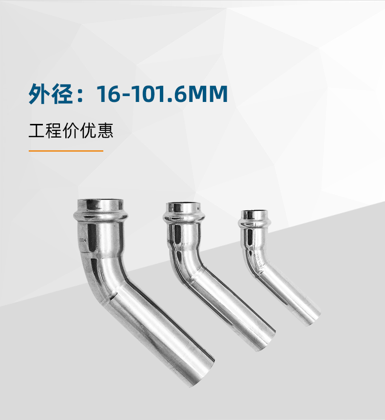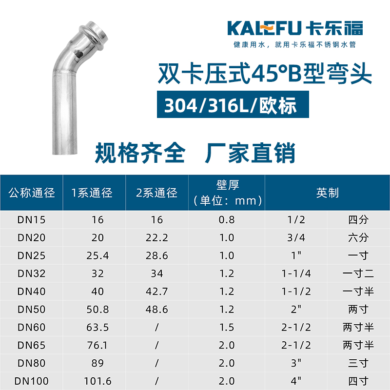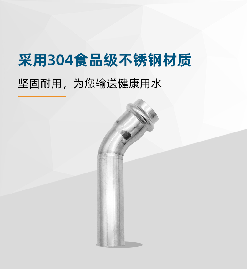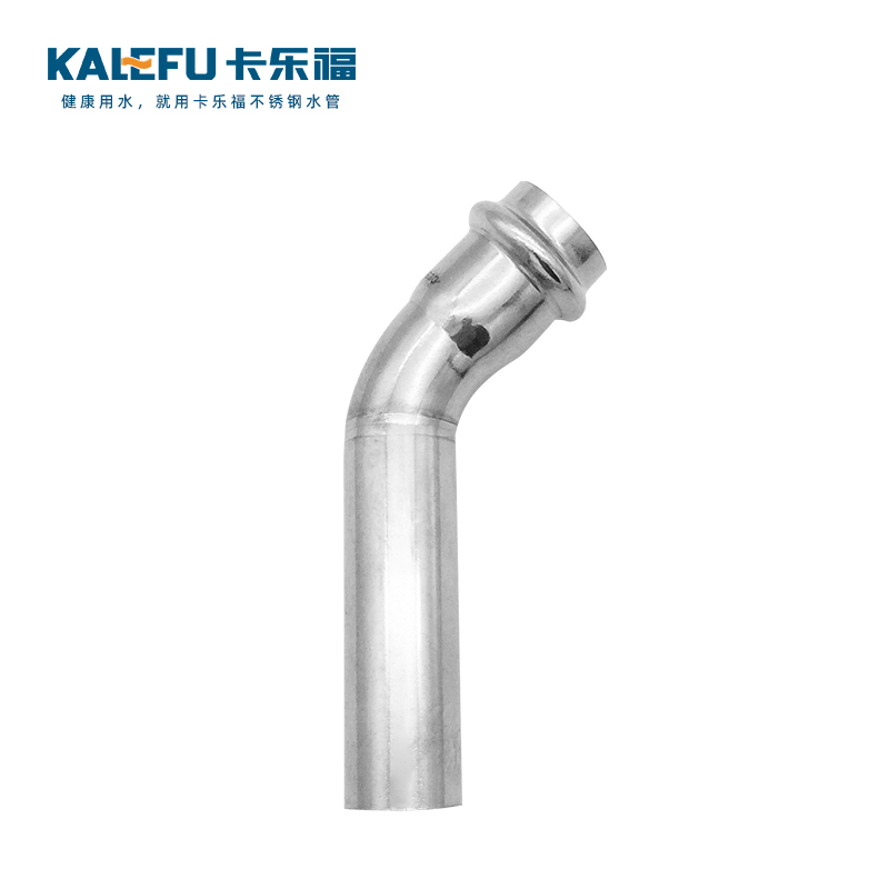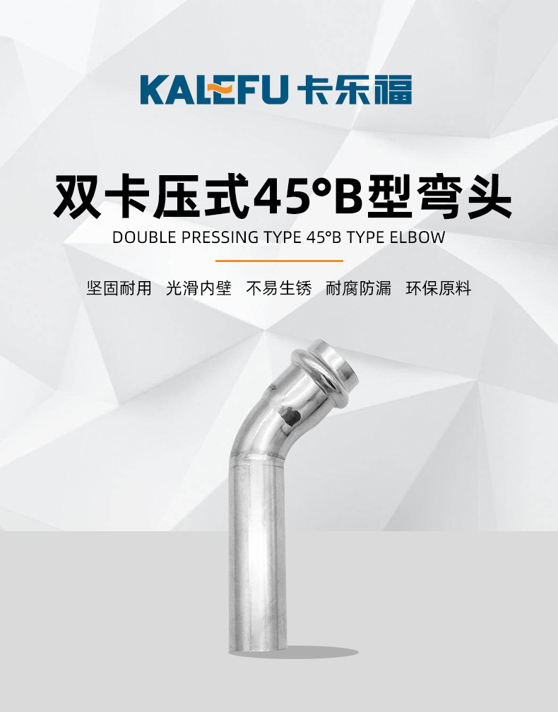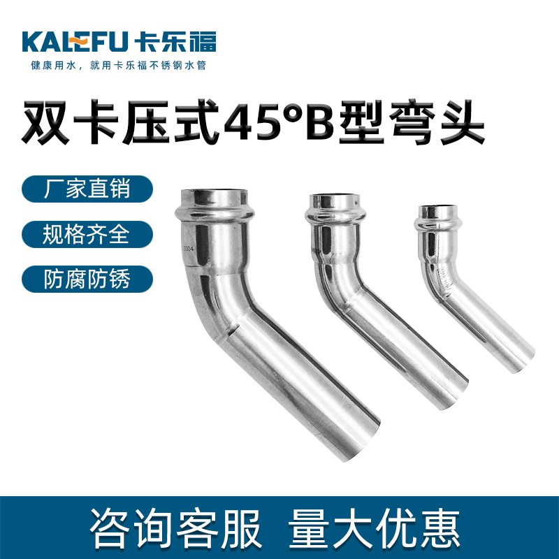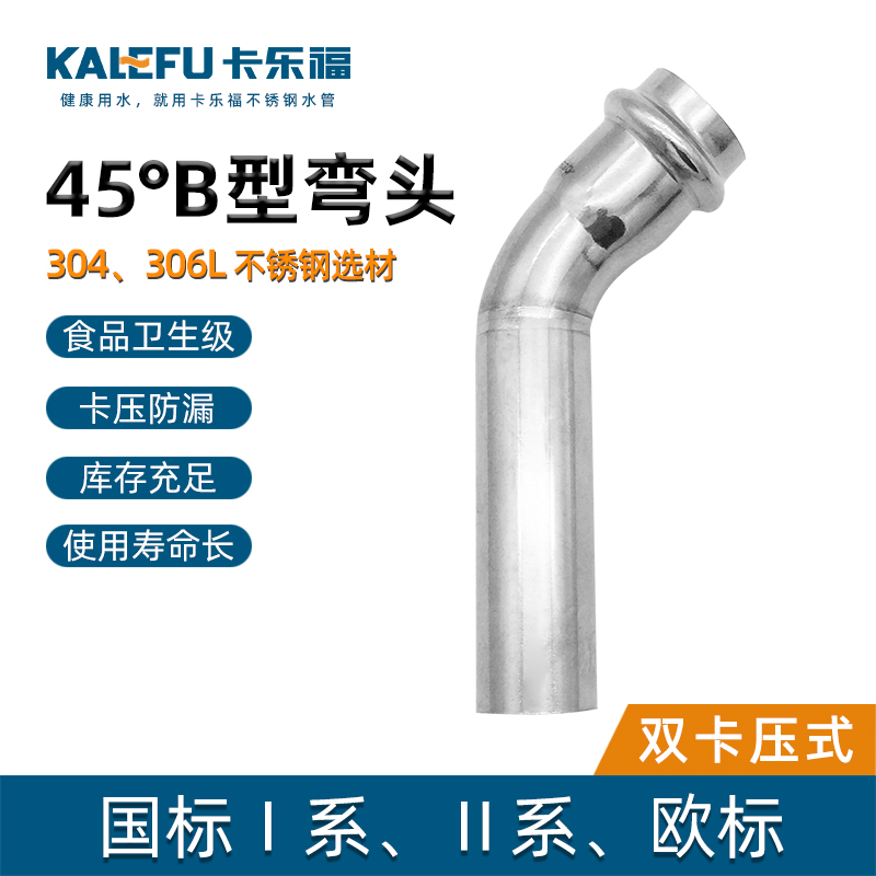 不銹鋼水管雙卡壓管件,雙卡壓式45°B型彎頭,304 316L不銹鋼材質,DN15-DN100通徑。本不銹鋼水管雙卡壓管件,雙卡壓式45°B型彎頭符合符合國標I系,國標II系,歐標。