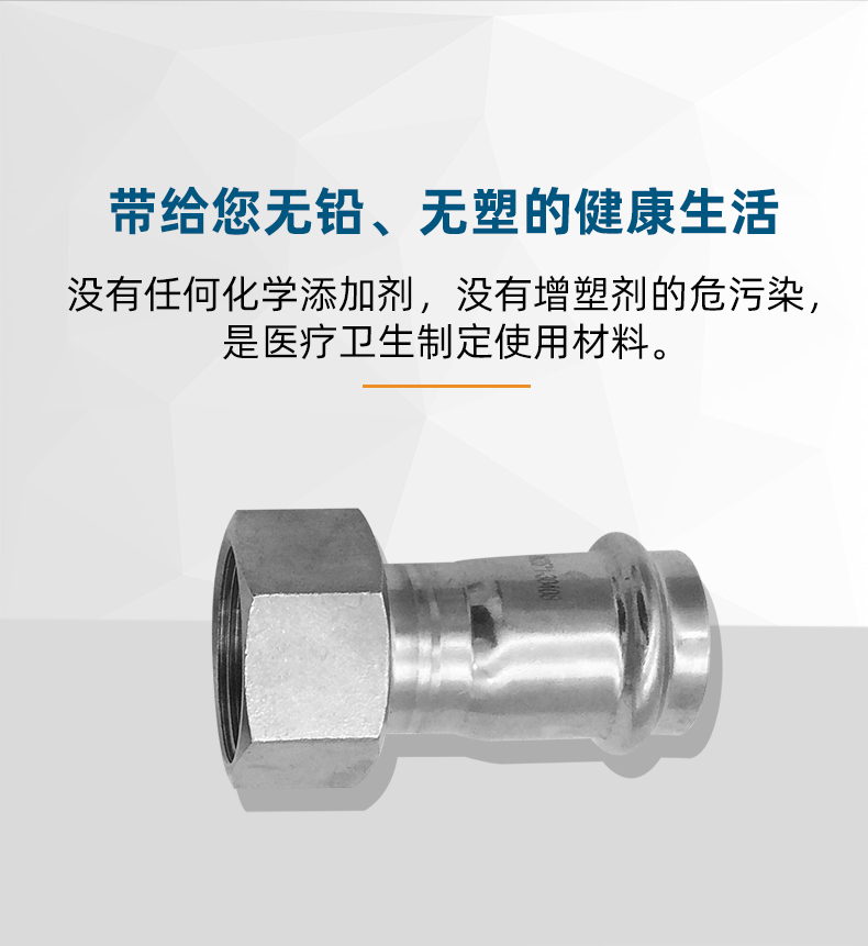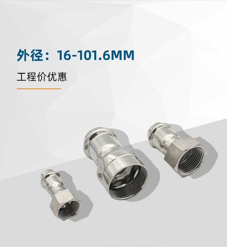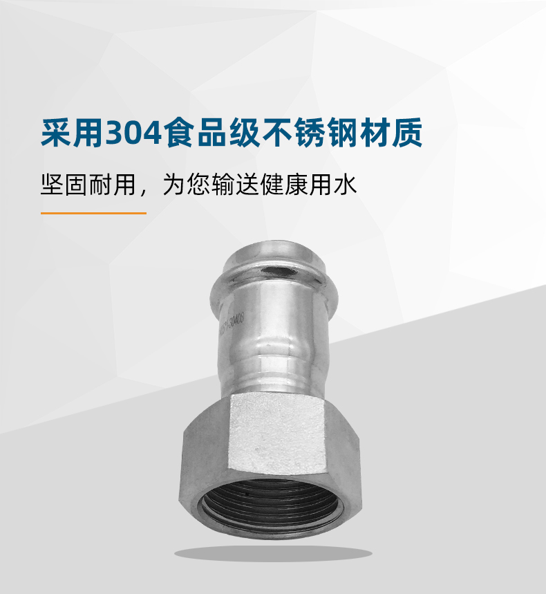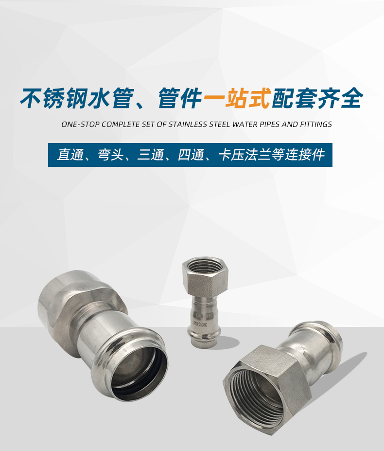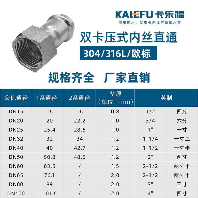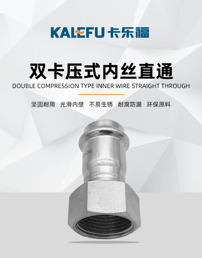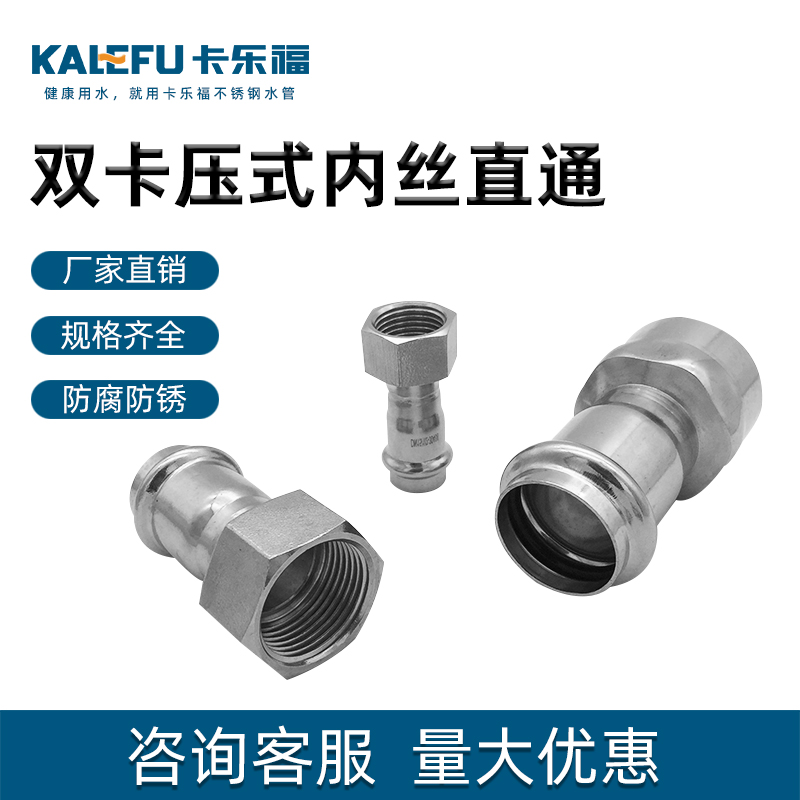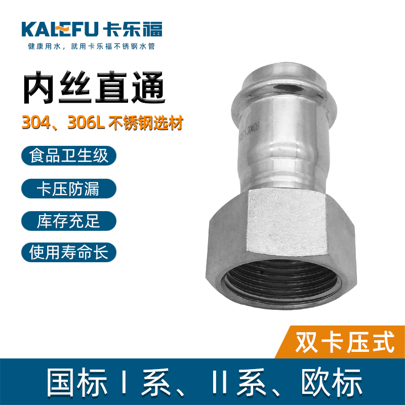 不銹鋼水管雙卡壓管件,不銹鋼水管雙卡壓式內絲直通,304 316L不銹鋼材質,DN15-100通徑。本不銹鋼水管雙卡壓式內絲直通管件符合國標I系、II系、歐標。
